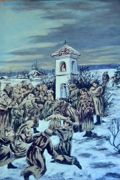 Nazajutrz 18 Stycznia przyszedł Katów obejrzeć miejsce swojego mordu. Lud, z odkrytymi głowami, wokoło cerkwi modlił się i klęcząc śpiewał godzinki do N. Maryi Panny, patronki wspomożenia wiernych. Ponieważ krew dookoła cerkwi rumieniła ziemię, więc naczelnik rozkazał żołnierzom nawozić piasku i zasypać wszystkie zbroczone miejsca na śniegu.